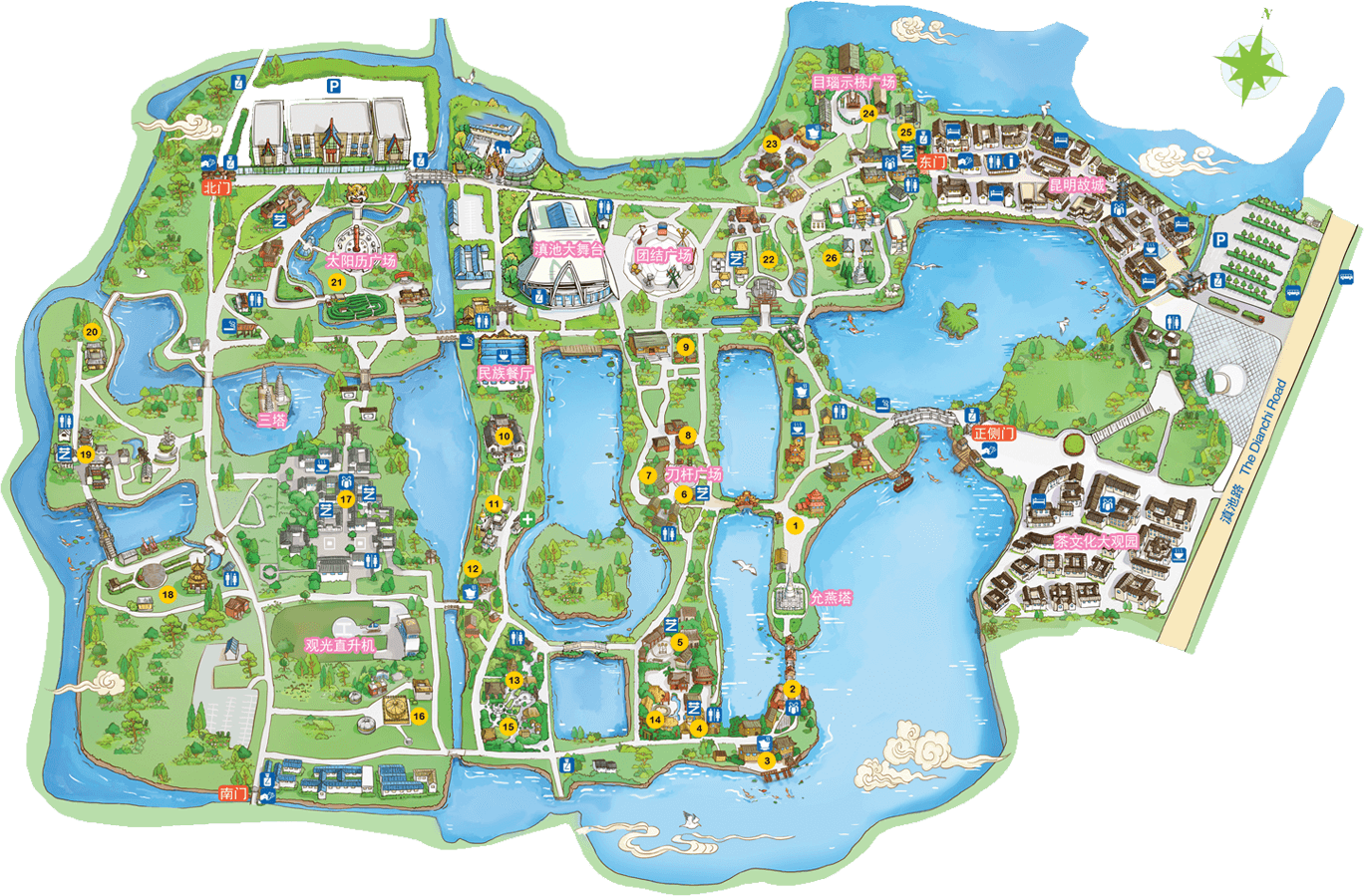 傣族人口約107萬人,主要分布在云南的德宏傣族景頗族自治州、西雙版納傣族自治州及瀾滄江流域的河谷壩子區(qū)域。傣族寨是進(jìn)入民族村的第一個(gè)村寨,占地面積27畝,三面環(huán)水,綠樹掩映。一幢幢“干欄式”傣家竹樓,通過蜿延的紅砂石小徑聯(lián)向肅穆的緬寺。巍峨壯觀的白塔,精巧玲瓏的風(fēng)雨橋,以及風(fēng)雨亭、水井、鐘亭等建筑充滿著傣家的濃郁風(fēng)情,是傣寨真實(shí)的民間景觀再現(xiàn)。一年一度的“潑水節(jié)”期間,這里都有活潑歡快的“象腳鼓舞...